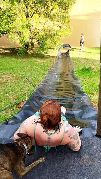 Excited Dog Slips Down Waterslide