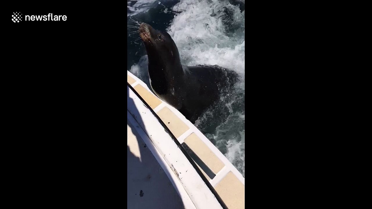 Sea lion follows fast-moving boat