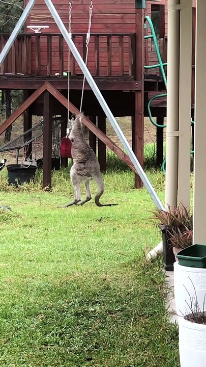 Wild Kangaroo Joey Playing with a Swing