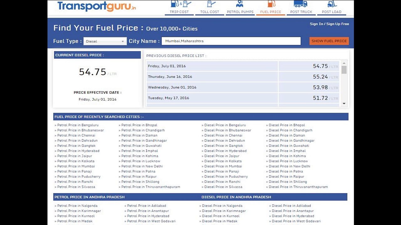 Current Diesel Price | TransportGuru.in | Diesel price in India | Petrol Price in india