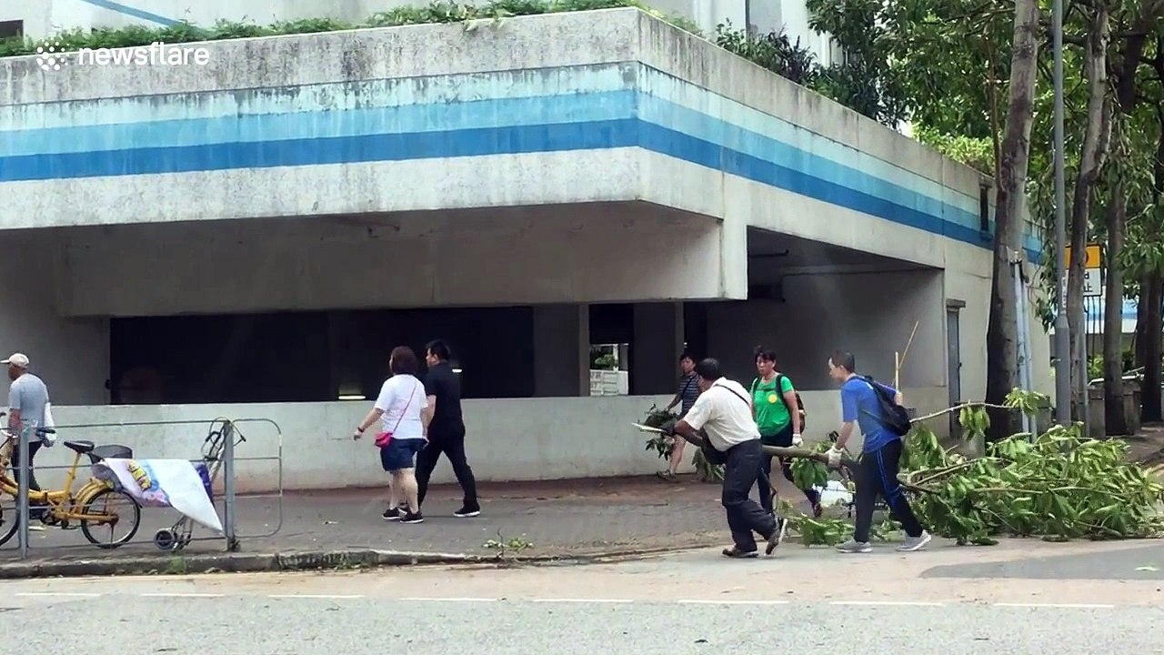Locals help to remove tree felled by Typhoon Mangkhut in Hong Kong