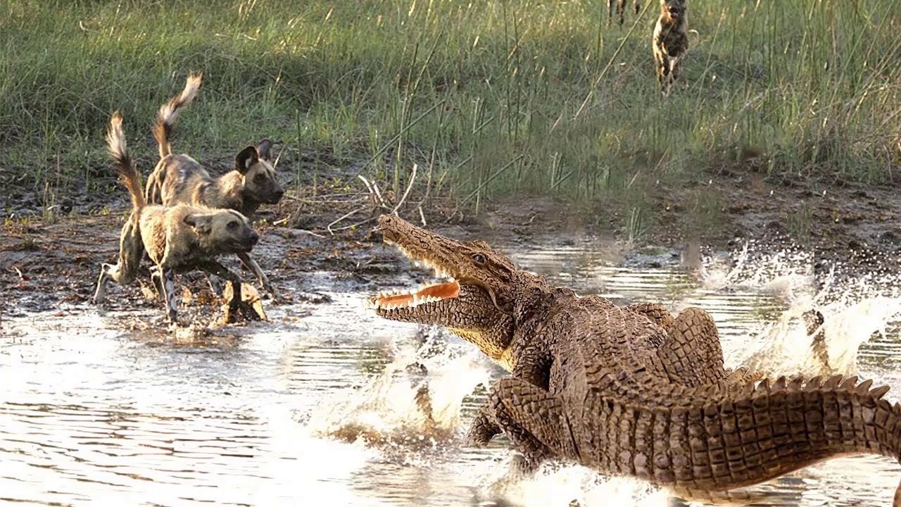 Crocodile Vs Wild Dogs - Crocodile Hunting Too Early And Fail In African