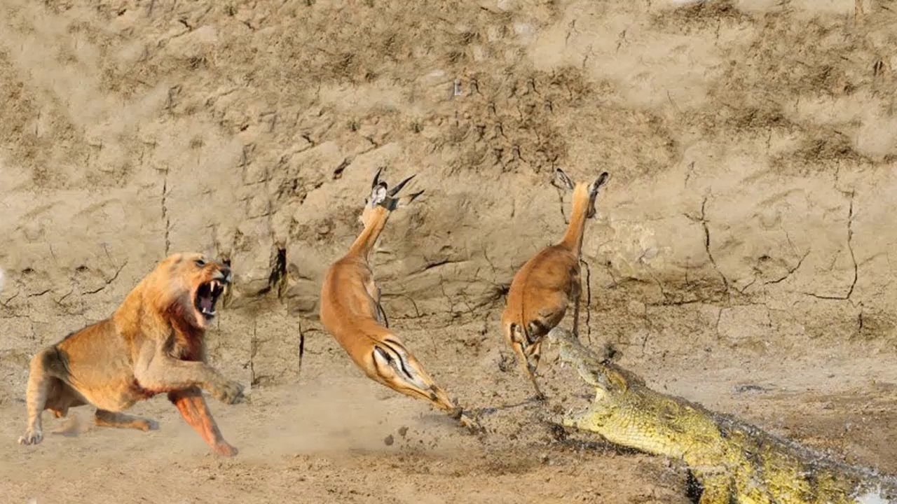 Impala Escape Crocodile Hunting But Fail Escape Lion - Poor Impala