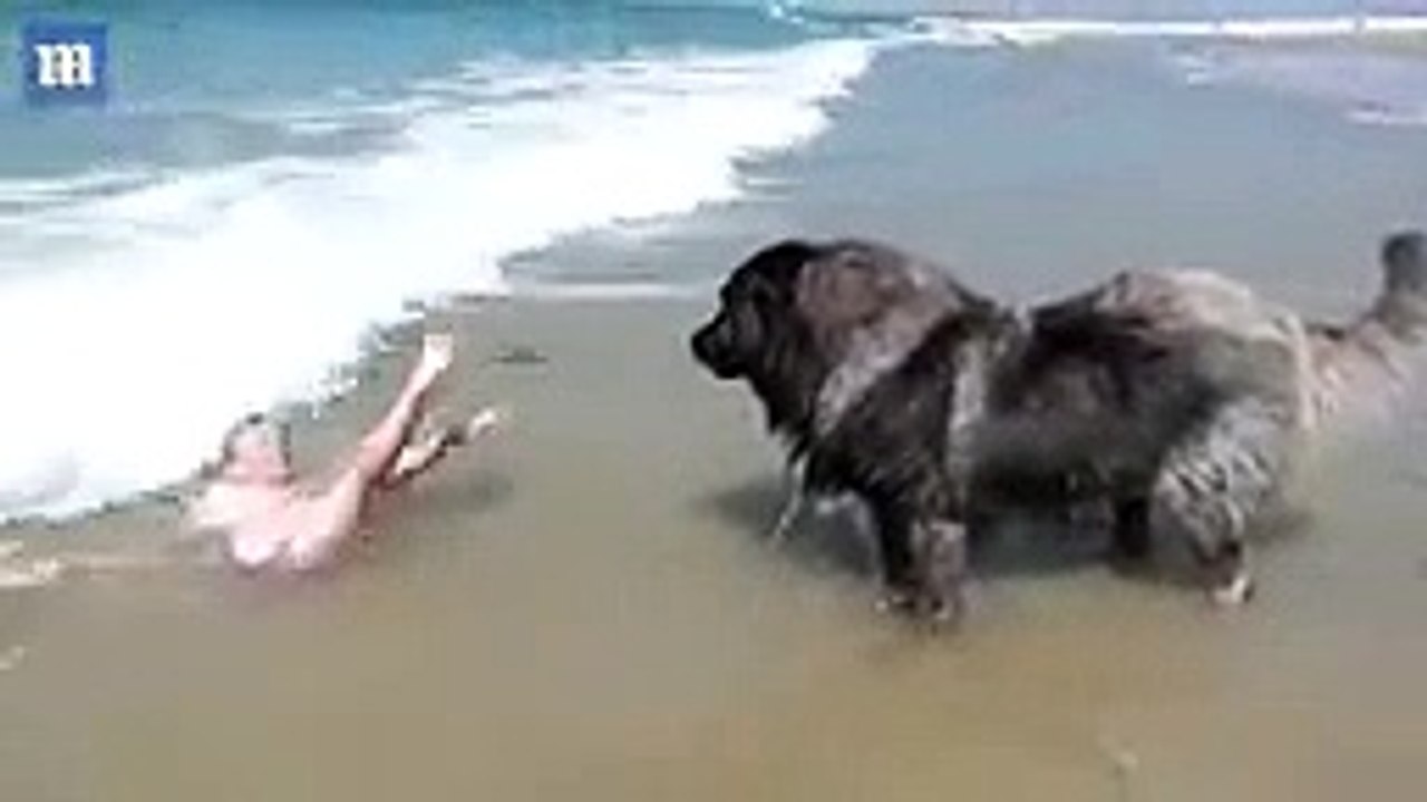Adorable moment hero dog' girl who is playing in the sea