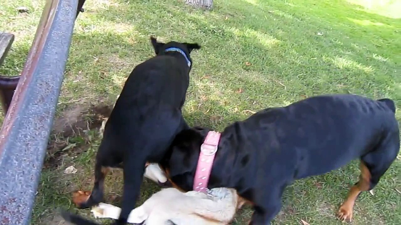 Siberian Husky Playing WIth Two Rottweilers