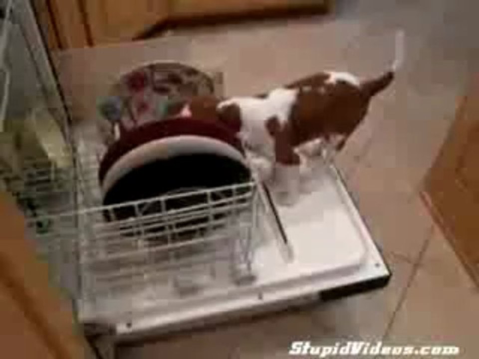 Perro limpiando los platos