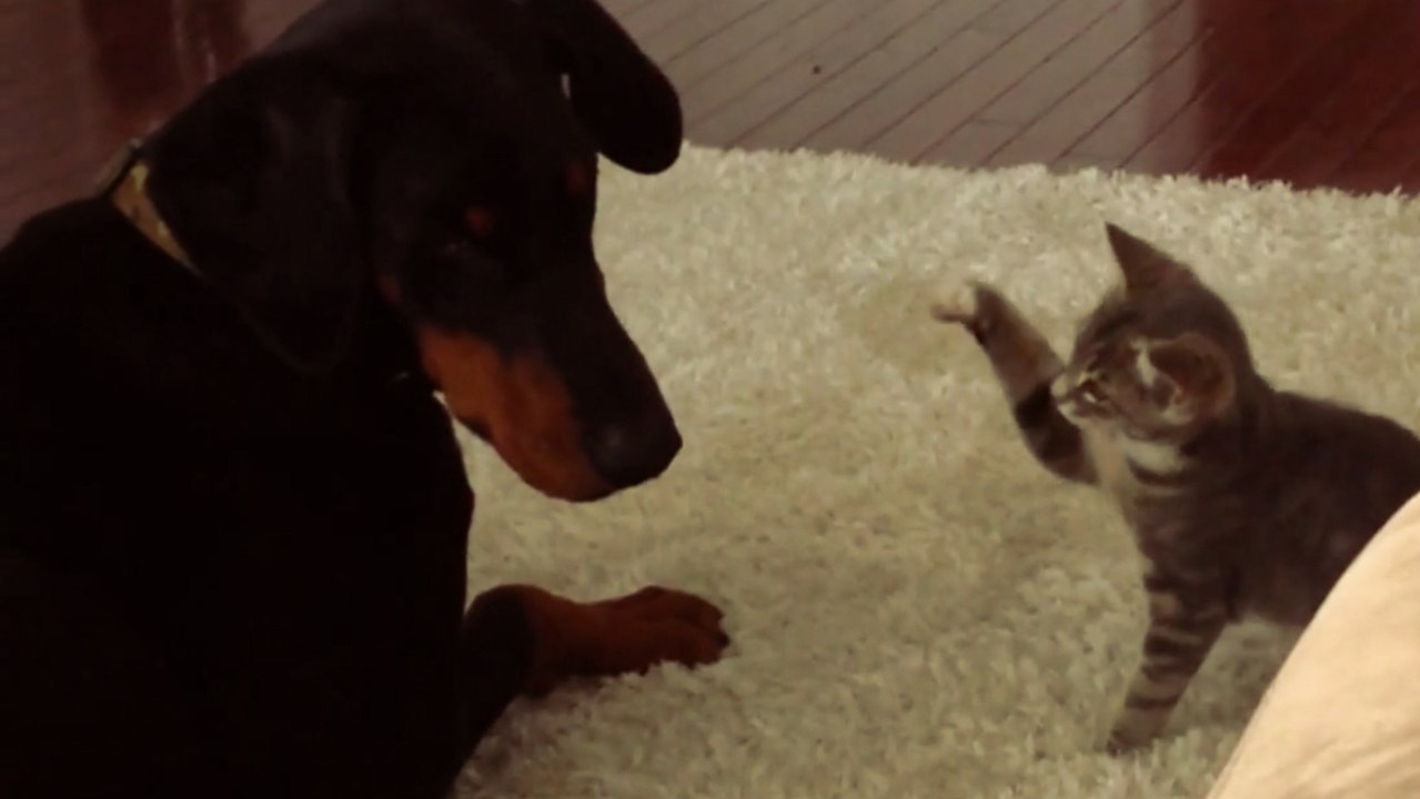 Un chaton 'ninja' face à un Dobermann bien plus grand que lui