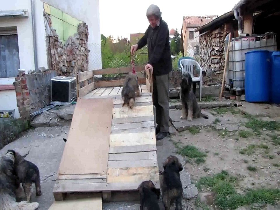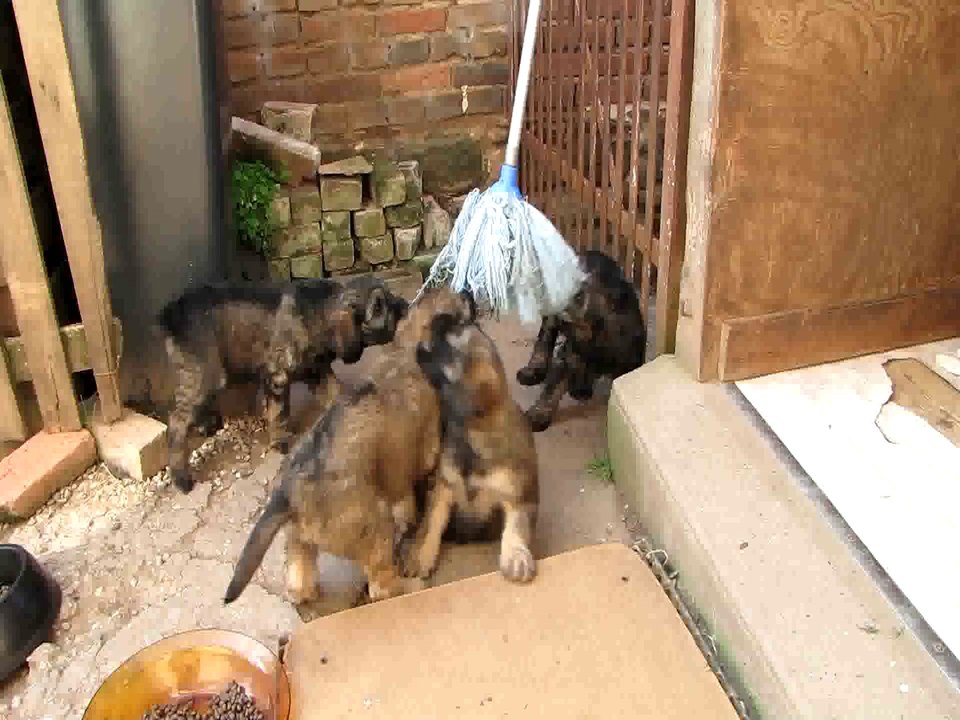 Les chiots appellent Fiby au jeu. (Chiots berger catalans 2014)