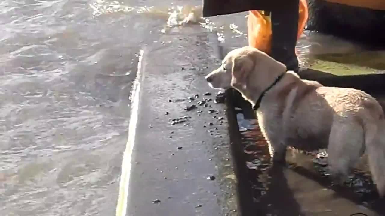 Baby tries filling dog bowl with water using only her hand