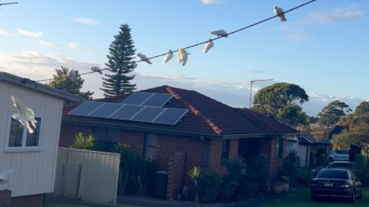 Rowdy cockatoo tips other cockatoos sitting on an electric wire