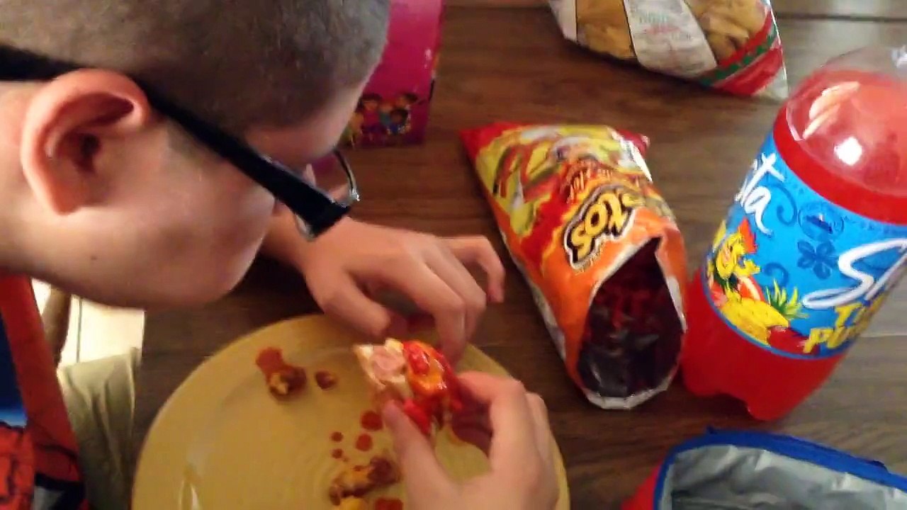Jacob tries hot sauce with Cheetos on a weenie.