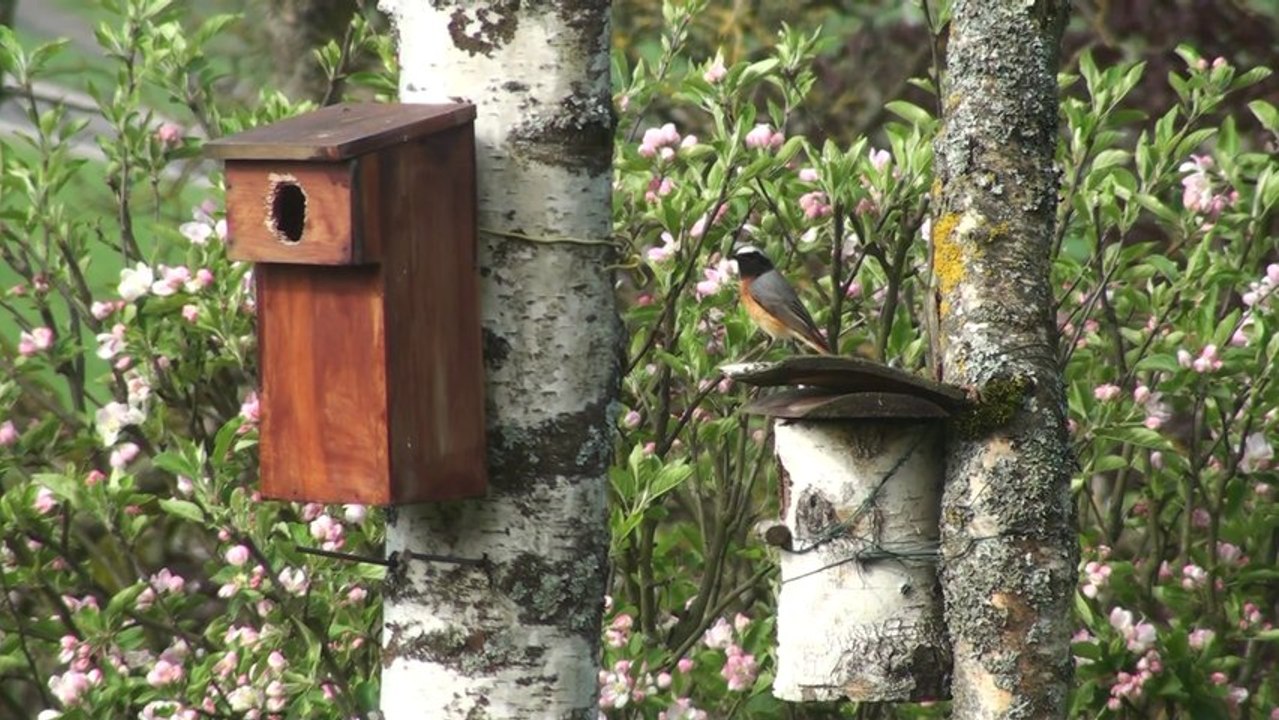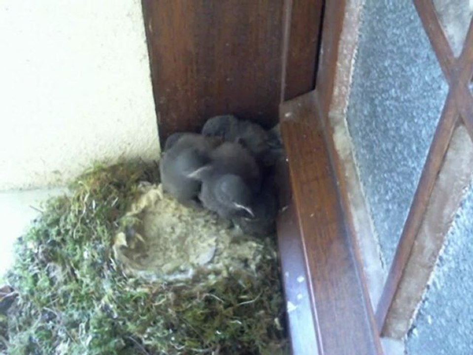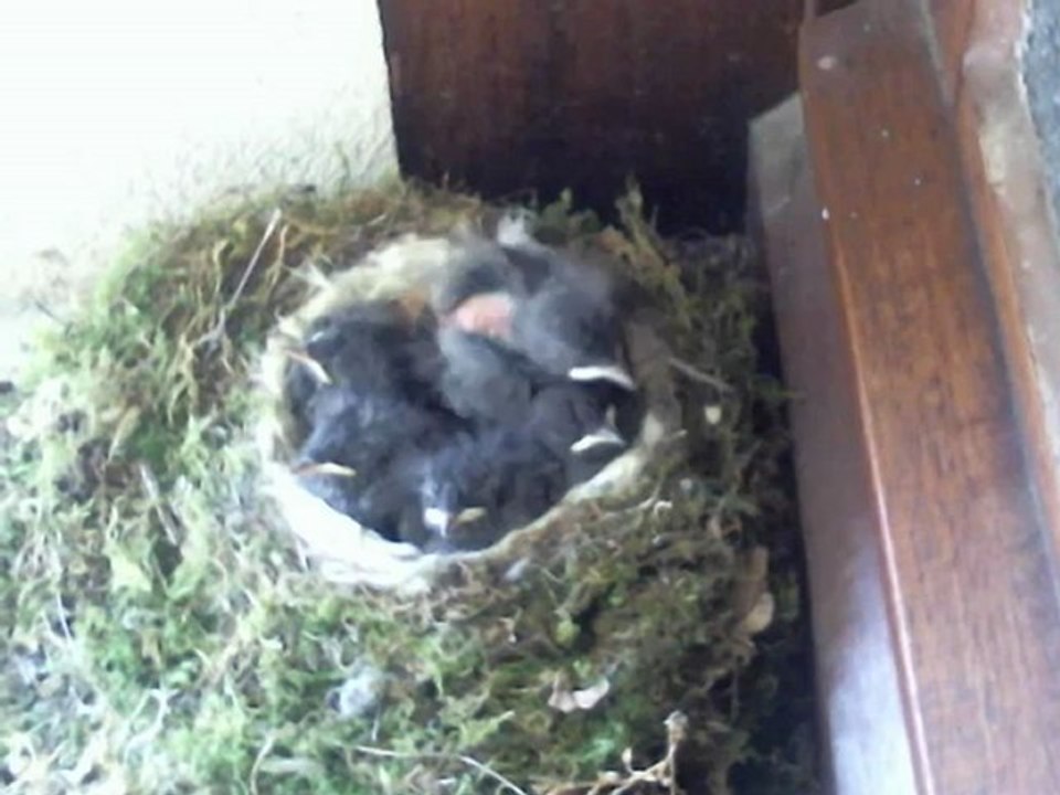 Les 5 petits rouges-queues sont nourris et nettoyés (!) jusqu'à leur premier envol. Les parents leur amènent des graines et des vers et emportent leurs déjections afin de garder le nid propre.