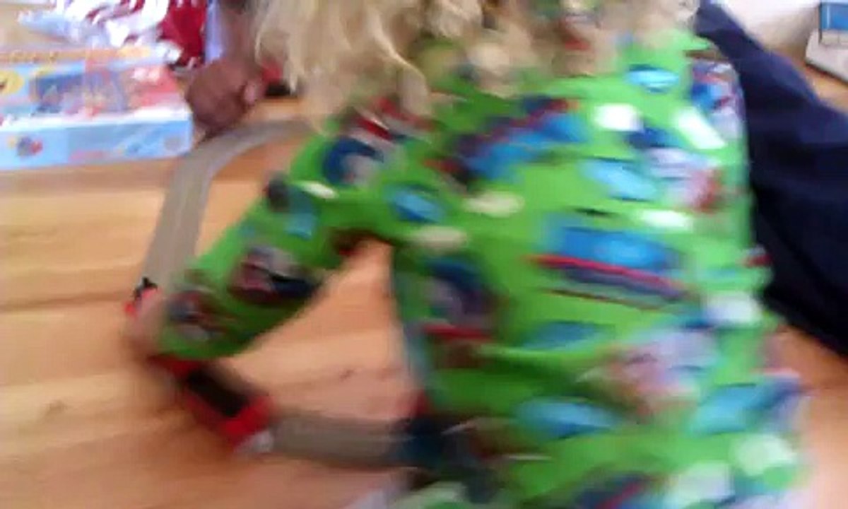 Xavier playing with trains on fake christmas