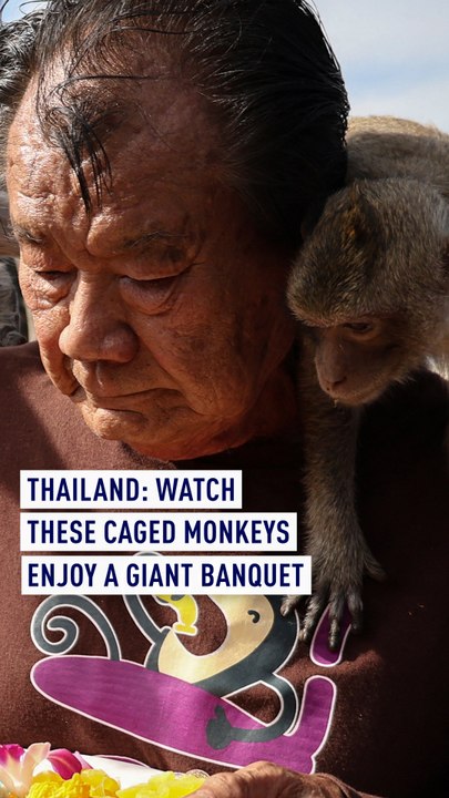 Thailand: watch these caged monkeys enjoy a giant banquet