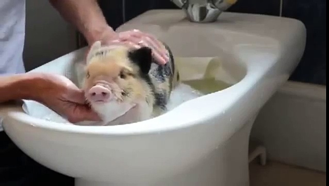 Свинья чистюля. Смешную свинью купают