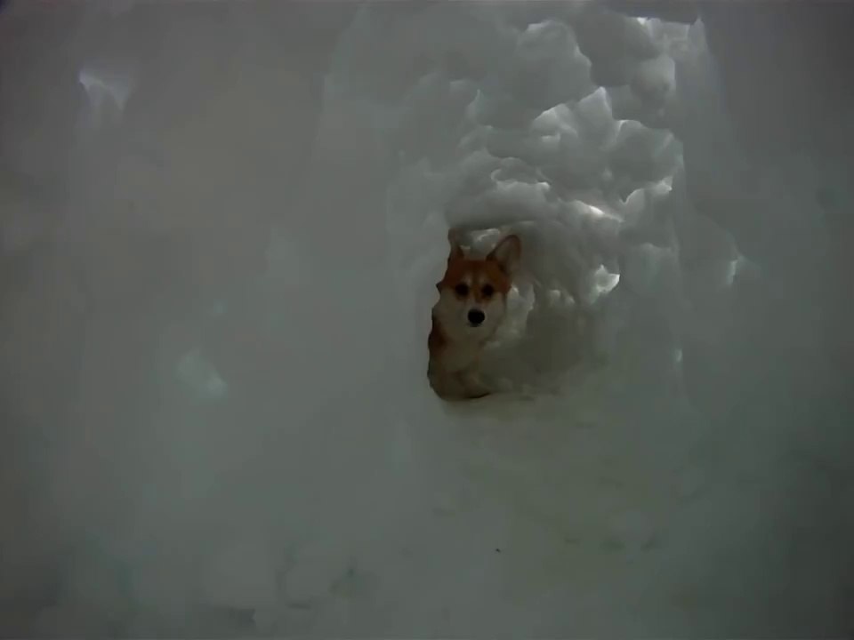 Corgi finds a snow tunnel