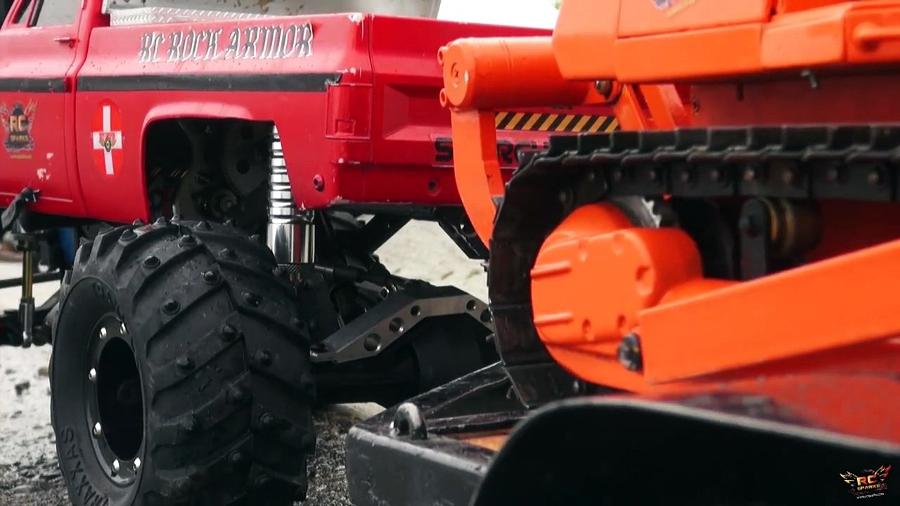RC ADVENTURES BEAST Monster Truck pulls Mini Dozer on Trailer Heavy Snow Removal