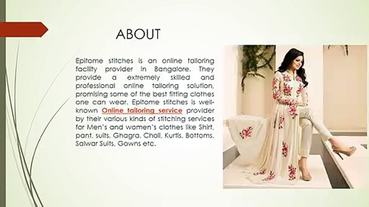 If you have seen a dress on the other person and you want it too, so you can speak to a better and professional designer or tailors online. If you have a fabric for stitching and you need something new and fashionable so you can take help through tailors online or their skill of online tailoring. For more details visit our website: http://epitomestitches.com