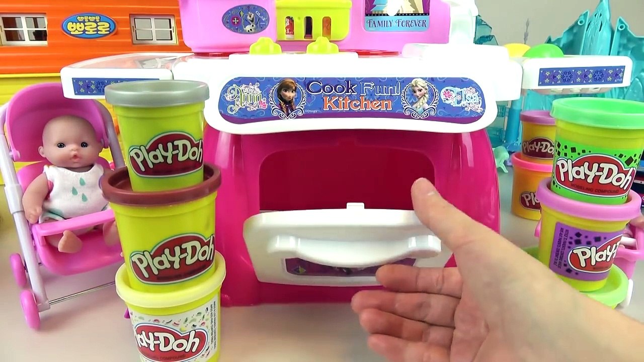 Baby doll and Frozen kitchen toys play doh cooking play