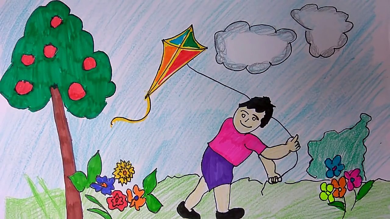 Children flying kite drawing, kids flying kite poster, kite festival poster for kids