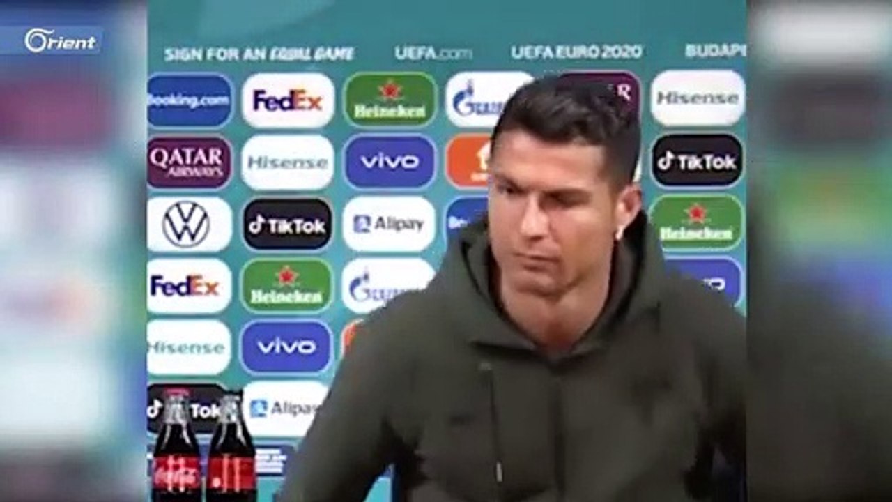 لحظة إبعاد رونالدو لعبوتين من مشروب كوكاكولا من المنصة