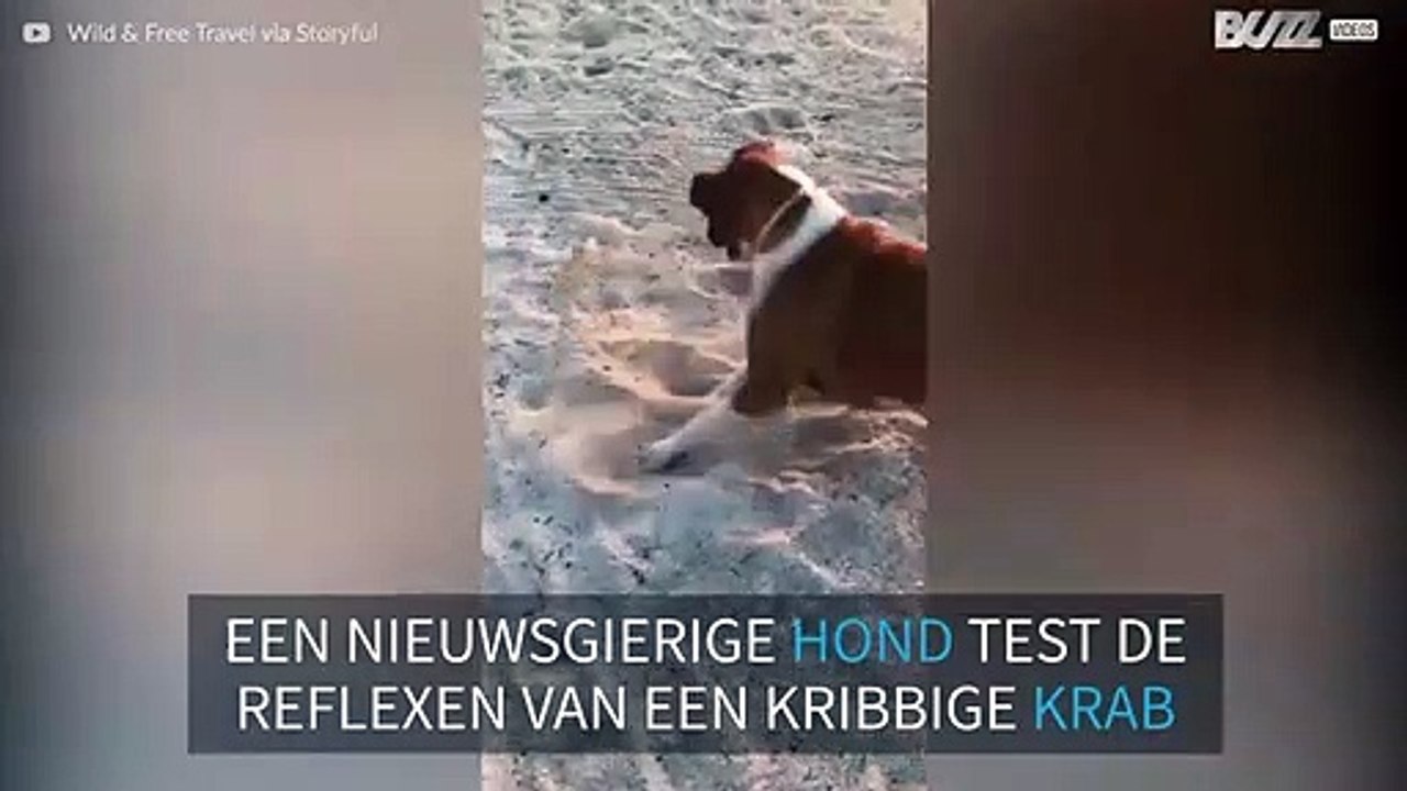 Een komische ontmoeting op een Mexicaans strand tussen een nieuwsgierige hond en een watervlugge krab