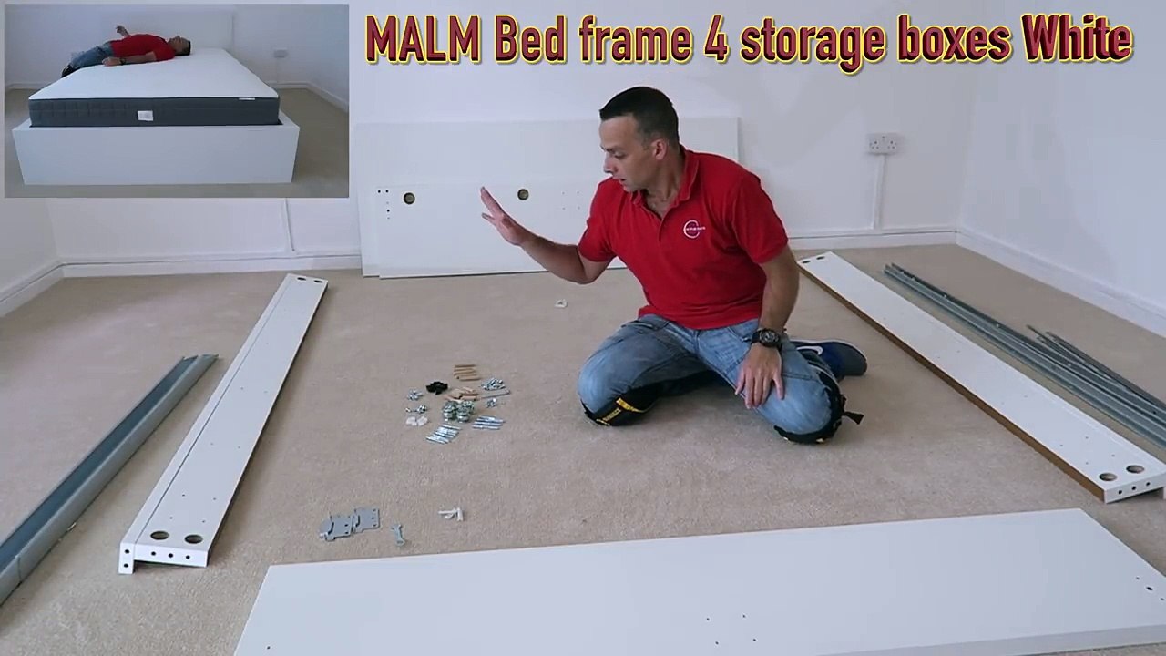 Ikea MALM Bed frame assembly with 4 storage boxes White/luröy