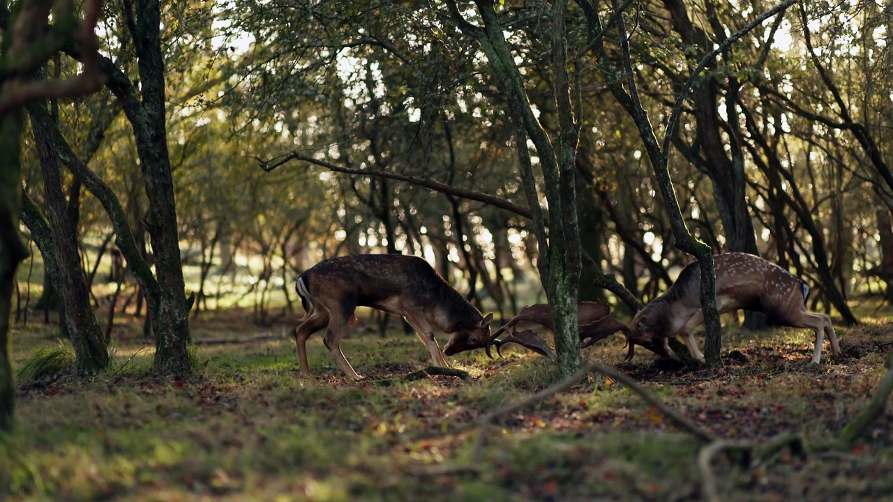 Deer engage in a territorial fight in a dense forest during rutting season