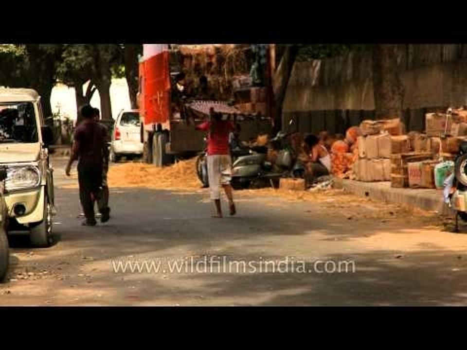 Young boy walking on the road with traditional bed on his head in Sarojini Nagar