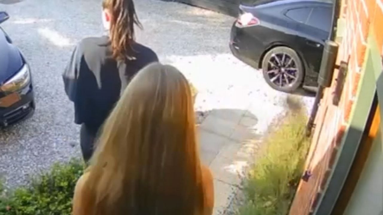 The doorbell camera shows Luke and his wife approaching the entrance door.