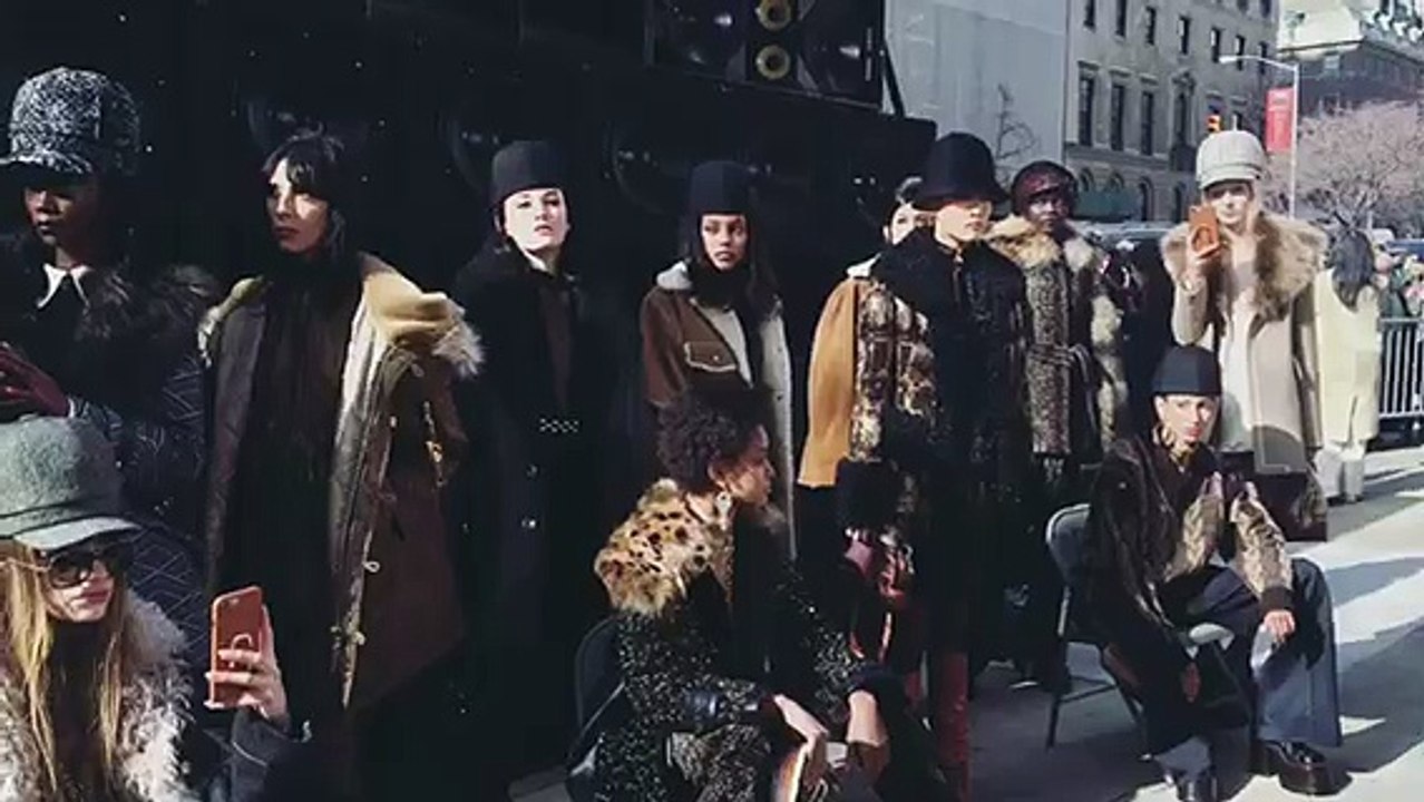All the models of the #MarcJacobs show are meeting the guests outside the venue for a group shot, with big speakers behind them playing loud music.