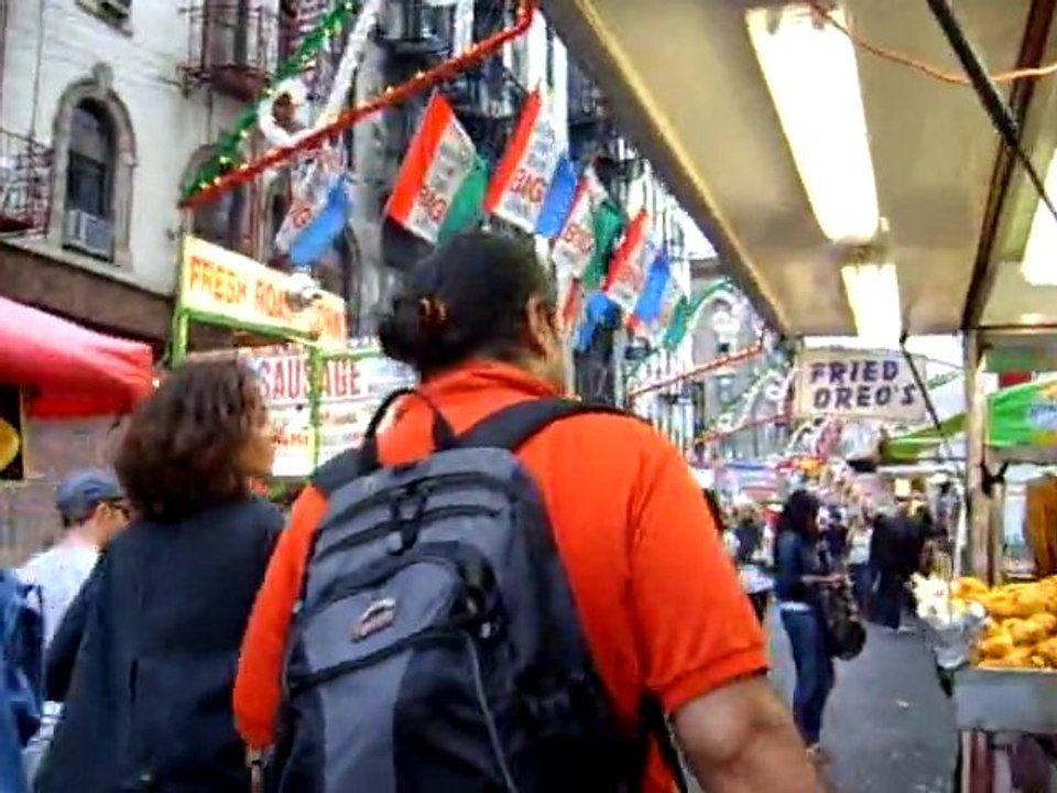 Callback filmmaker Kartik Singh and stars Maud Buquet and Saul Jephcott walk through Mulberry Street during the San Gennaro festival.