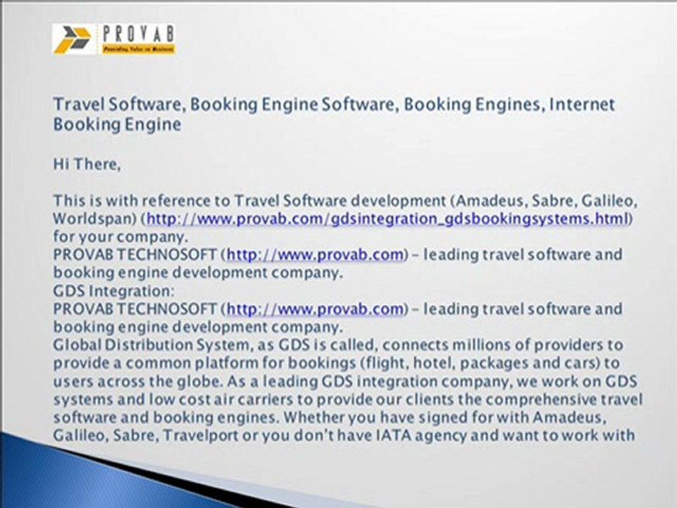 PROVAB TECHNOSOFT, a leading travel technology company, provides innovative solutions like online booking engines and travel booking engines to customers across the globe. PROVAB develops hotel booking engines, travel booking engines, RIA rich internet applications, custom application development and online booking engines. Hotel Booking Engines are multi-lingual, web based internet booking engines, connected with multiple xmls for global inventories. The online booking engine comes with B2C (Business to Customers) and B2B (Business to Business) modules to cater end clients and agents as well. The hotel booking software is compatible with 23 hotel xmls. For more details please visit : http://www.provabtechnosoft.com/