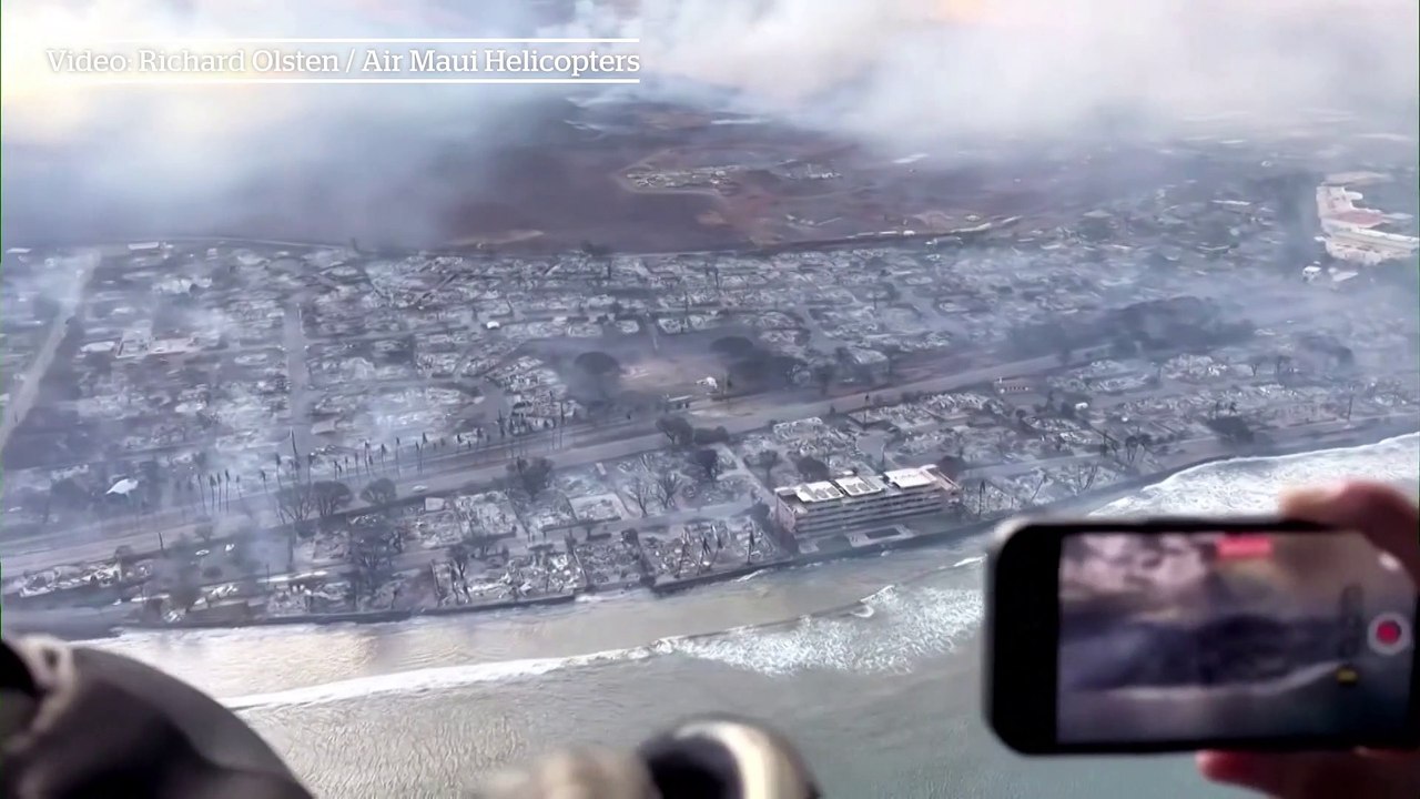 Aerial footage shows charred landscape in resort city of Lahaina, Maui