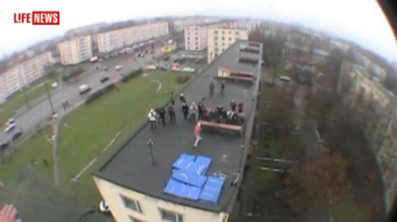 Saut dans une piscine depuis le toit dun poolhouse (Russie)