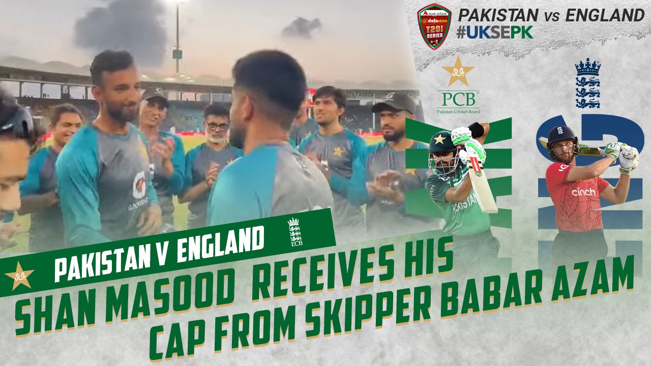 Pakistan's T20I player No.97 Shan Masood receives his cap from skipper Babar Azam | PCB | MU2L