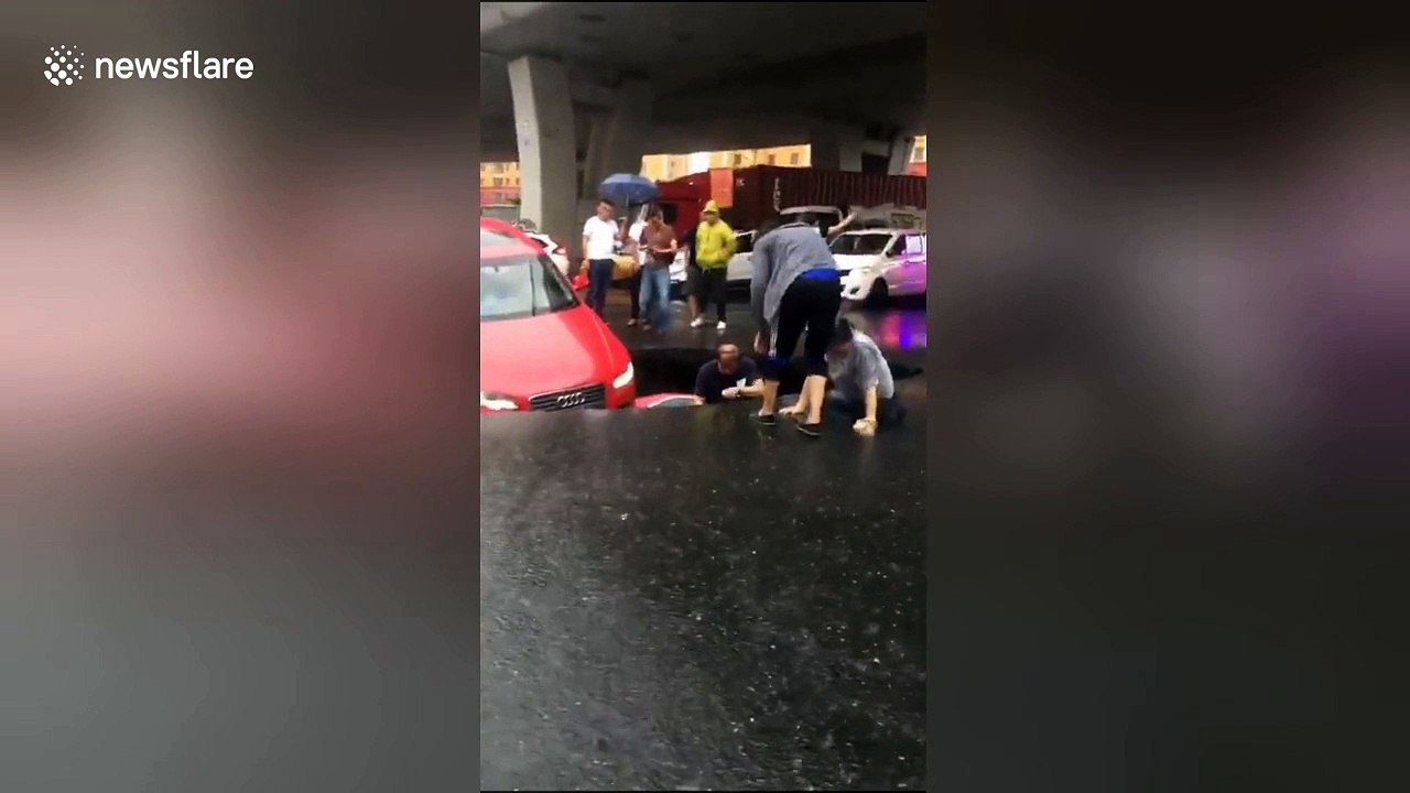 Cars drop into sinkhole caused by road collapse